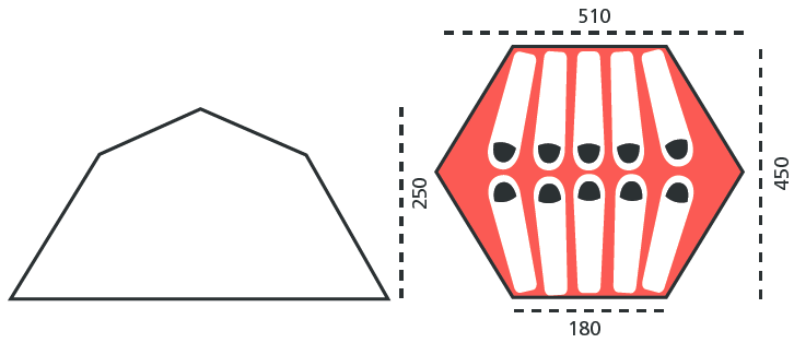 2,5 m Höhe in der Mitte und hohe, bogenförmige Eingänge Stehhöhe im gesamten mittleren Zeltbereich Viel Platz zum Entspannen für Sie und Ihre Freunde